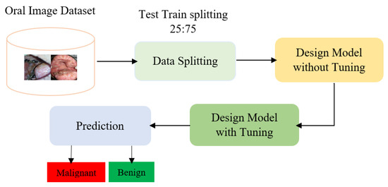Automating the detection of these lesions will reduce costs and allow the disease to be diagnosed earlier. Furthermore, perfect detection will help physicians provide the correct treatment and reduce the suffering of patients, as treatment at the last stage is very costly. Artificial intelligence (AI), machine learning (ML), deep learning (DL), transfer learning (TL), and digital image processing can be used to build an automated system for detecting lesions. There are several ways to automate the diagnosis of oral cancer. AI is a computer science field that uses computers and machines to simulate the human mind’s problem-solving and decision-making skills. ML and DL are subfields of AI, but the two terms have different ways of working. ML learns from previous data without any explicit programs and predicts the outcome accurately. DL works like a human brain structure. There are many data types for classification using AI, ML, and DL. Some of them are text data, image data, structured data, unstructured data, sensor data, social data, and so on. The particular problem at hand, the characteristics of the data, and the employed methods all influence the choice of data type. Models for machine learning and deep learning are trained using data that are most pertinent to the purpose for which they were created. We used image data types in this paper. For predicting malignant lesions or benign lesions, a microscopic image can be used [9,10]; either a real-time high-regulated image or hyperspectral mouth image can also be used [11], and even a computed tomographic (CT) image [12] or fluorescence image can create a good dataset [13]. The field of computer vision is gaining popularity with convolutional neural networks (CNNs) [9,10,11,12,13]. However, large-scale, reliable clinical data are required for employing deep learning in the early diagnosis of oral cancer. The researchers examined a machine [14,15] for classifying oral cancer and dental disease. The contributions of this work are as follows.