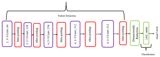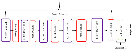 VGG19 is a convolutional neural network model proposed in [31]. The model demonstrated a top-5 test accuracy of 92.7% on the ImageNet dataset, which included more than 14 million images dispersed across 1000 different classes. VGG19 is a variant of the VGG model, which uses 19 layers, including 16 convolutional layers, 5 max-pooling layers, and 3 fully connected layers. Figure 3 shows the regular architecture of the VGG19 model. VGG19 is widely used in applications such as object detection, image classification, and image segmentation [32].