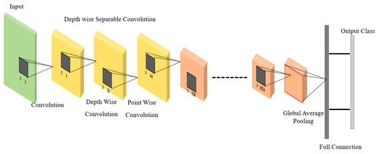 MobileNet is a deep learning-based computer vision algorithm for efficient on-device image classification. Figure 5 shows that MobileNet combines depthwise separable convolutions and linear bottlenecks. The depthwise separable convolutions split the traditional convolution operation into two separate operations, reducing the number of computations and the number of parameters, which helps reduce the network’s size and computational complexity. The linear bottlenecks further reduce the number of parameters in the network and make it more computationally efficient [33].