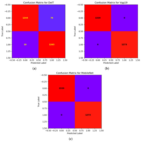Confusion matrices of the models: (a) DeIT; (b) VGG19; (c) MobileNet.
