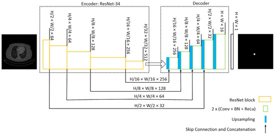 The U-Net architecture in this model utilizes a pre-trained ResNet-34 [29] encoder with an ImageNet dataset. Four skip connections are extracted from the encoder and passed to the decoder section. To ensure compatibility of the pretrained encoder with our dataset, the input images are duplicated into three channels.