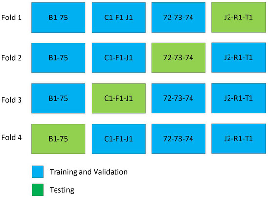 To evaluate the model’s performance, we employed 4-fold cross-validation [30], as depicted in Figure 4. The training process involved using Binary Cross Entropy, the Jaccard loss function, and the Adam [22] optimizer. For and representing input and output for each slice, the input to the model is where and are height and width of the image and is the number of channels, and the output of the model is as shown in Figure 3.