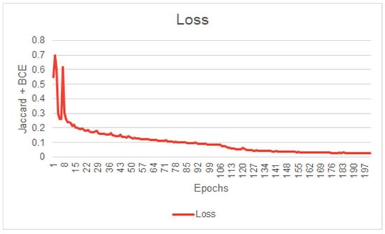 During the training process, we utilized a combination of binary cross entropy (BCE) and Jaccard index as the loss function. The Jaccard index, also known as the Intersection Over Union (IOU) index, serves as the complement of the IOU score. On the other hand, binary cross entropy is expressed by Equation (6), where y represents the true label and represents the predicted value.