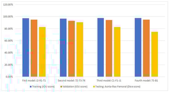 Figure 6 displays the performance of the model (as presented in Section 2.2) through cross-validation. In this figure, each of the four models corresponds to a fold in Figure 4. Specifically, the first model results from training on the first fold of Figure 4, the second model from the second fold, and so forth. Additionally, three metrics are displayed for each fold of the cross-validation. The bar in blue (left bar) indicates the final performance of the network during its training, averaging 97.3% across all cross-validation iterations. The orange bar (middle bar) represents the network’s performance when obtained from the validation set during training, maintaining an average of 95% across the four models. Generally, the validation performance is lower than the training because these images are not used in the network’s training. The yellow bars (right bar) indicate the performance of each model in the segmentation of the testing dataset shown in Figure 4, with an average Dice score of 83.4% (individual scores are detailed in Figure 7). As expected, the performance of the networks is the lowest compared to the training and validation sets and exhibits the largest variation due to the small number of patient images. Notably, the second model displayed superior performance when tested on the “72-73-74” patients, which were optimized demonstration scans provided by the manufacturer of the CT scanner. These specific data lacked the variability observed in the rest of the dataset (which included patients imaged at several locations), leading to inflated accuracy measures. The first model and the third model, as runners-up, exhibited similar performances, with a marginal 0.7% higher IOU score in validation for the first model.