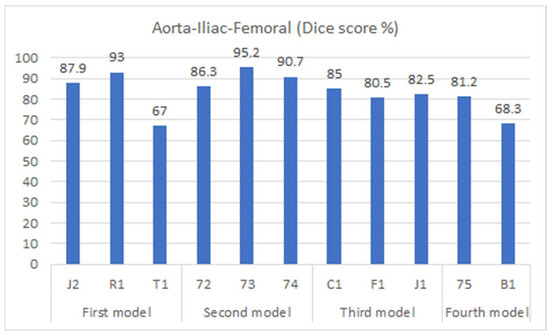 State-of-the-art ML models have primarily concentrated on segmenting multiple organs, as demonstrated in the ‘Synapse Beyond the Cranial Vault’ dataset (https://www.synapse.org/#!Synapse:syn3193805/wiki/217785, accessed on 10 August 2023). Among the participants, DAE stood out with an average Dice accuracy of 92.1% for segmenting abdominal organs, including the aorta [39]. However, it is important to acknowledge that the aorta is relatively easier to segment than other parts of the vasculature. Moving towards the lower body, the branches of the vascular system diminish significantly in diameter, posing new challenges for segmentation. Unfortunately, there remains a relative scarcity of approaches that specifically address vascular segmentation and calcification measurement. Lareyre et al. [25] introduced a hybrid system utilizing convolutional neural networks to segment the vascular system from the aorta to the iliac arteries, achieving a Dice similarity coefficient of 82.6% in lumen segmentation. In this research, we further improved upon this performance by incorporating a pretrained ResNet within the U-Net structure and applying augmentation techniques, resulting in a score of 83.4% for lumen segmentation, extending our analysis beyond the iliac arteries and encompassing the femoral arteries. It is worth noting that our study was conducted with a smaller dataset compared to the dataset used by Lareyre et al. [25], which could have influenced the performance.