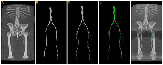 From the visualization, we observe a significant decrease in the size of the region of interest (ROI) in the femoral arteries, along with some blockages in the main arteries. During the annotation process, small adjacent arteries were excluded when they lacked continuity with major vessels, but the model was able to detect some of these small arteries, resulting in a decrease in the reported accuracy. By comparing Figure 8A,E in detail, we can verify that the automatically segmented arteries flagged in red, specifically in the right leg, are actual arteries that were excluded in the annotation process.