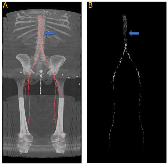 (A) Automated artery segmentation. (B) Automated calcification tracking in arteries in a CT image for patient “J2” after intensity thresholding on (A). The blue arrow indicates the location of the left renal artery, which serves as the starting point for measuring the calcium score.