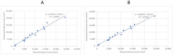 Linear regression analysis of automated and manual volumetric calcium scores for sixteen patient CTAs not used in training the ML model. R-squared was used to assess the correlation. (A) Shows the results after applying the first model. (B) Shows the results after applying the third model.