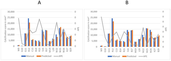 Comparison of predicted calcium volume and manual volumetric calcium scores, highlighting the corresponding accuracy. The left axis displays the volume of calcification, while the right axis represents the Absolute Percentage Error (APE). Patient identifiers are presented at the base of each bar. (A) Represents the accuracy of the first model. (B) Shows the accuracy of the third model.