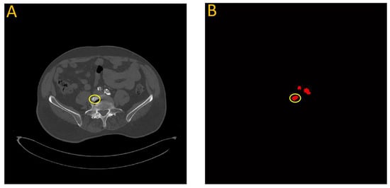 Failure analysis illustrates overestimation in the proposed model. (A) Input image; (B) Automated vascular segmentation using the model. The first model incorrectly identified a section of the vertebra, circled in yellow, as an iliac artery. This misidentification may be attributed to the roughly circular intensity exhibited by this particular vertebral segment, which bears resemblance to the characteristics of the iliac artery.