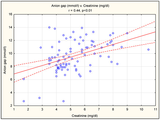 The serum anion gap (AG) is calculated as the difference between sodium (main cation) and major anion (bicarbonate and chloride) concentrations. The AG is affected by both measurable anions (albumin, phosphates) and unmeasurable anions, including those accumulated in kidney disease meltabilities, such as indoxyl, p-cresol and other uremic solutes [16]. Typically, for CKD, changes in the concentrations of measurable cations (potassium, magnesium, calcium) may also affect the level of the AG. We found a positive correlation between the AG and creatinine and urea concentrations (Figure 2 and Figure 3). This finding is consistent with the observations of others. The NHANTES data show a gradual increase in the albumin-corrected AG across eGFR categories, starting at 45–59 mL/min/1.73 m2 [17]. In another study, the AG was a marker for the retention of various solutes and a measure of renal tubular function, which, according to the authors, may provide a more sensitive measure of impaired renal function [17]. Elevated levels of uremic toxins (indoxyl sulfate and p-cresol sulfate) have been shown in patients with chronic kidney disease; however, it should be emphasized that the concentration of uremic toxins did not correlate with the GFR, possibly due to tubular secretion and reabsorption, which also play a role in the clearance of uremic toxins [18,19,20]. In addition, the net number of unmeasured anions appears to be an independent predictor of CKD progression and plays an important role in the development of CKD complications [17].