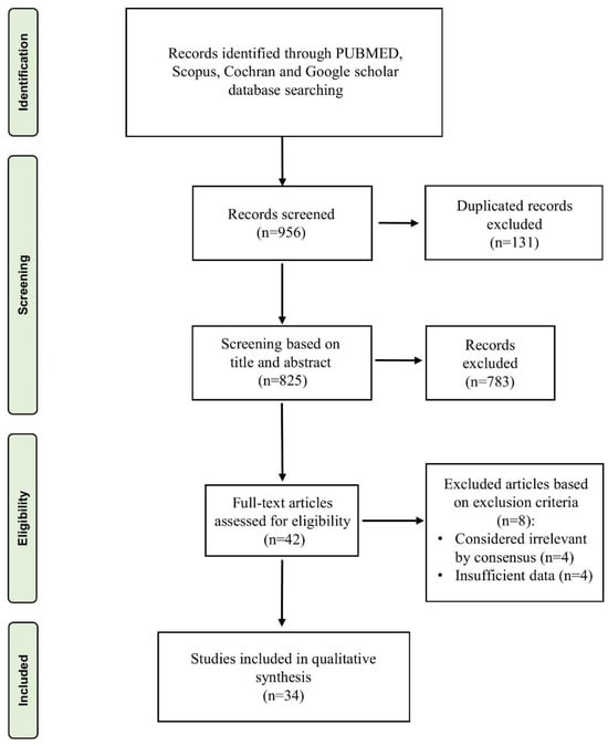 The flow scheme of the literature search conducted for the systematic review is presented in Figure 2. The literature search yielded a total of 956 studies. Following the elimination of duplicates, the research mentioned above team proceeded to evaluate a total of 825 titles and abstracts of manuscripts. The process of full-text evaluation led to the exclusion of 783 out of 825 articles due to their failure to meet the established selection criteria. The systematic review included 34 [2,4,10,22,23,24,25,26,27,28,29,30,31,32,33,34,35,36,37,38,39,40,41,42,43,44,45,46,47,48,49,50,51,52] studies, subsequently evaluated for quality assessment. The Cohen’s Kappa coefficient (к = 0.91) showed almost perfect agreement between the reviewers in the selection process.