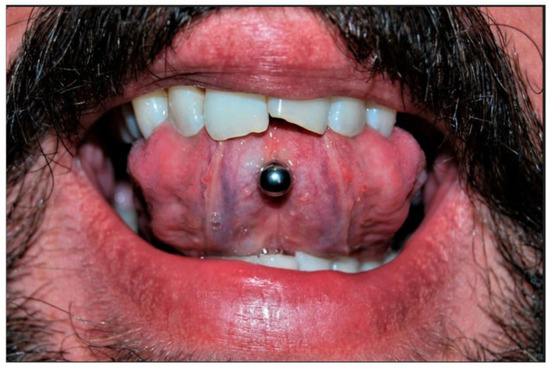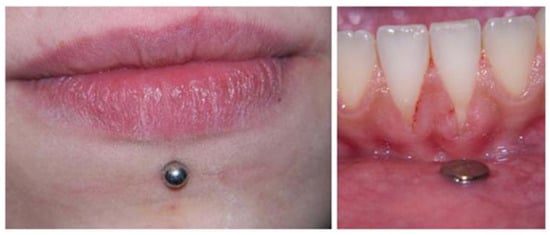 Piercing is a body ornamentation that different civilizations have accepted since the past as a manifestation of self-expression [1]. Today, body piercing is widely noticed among people, especially young people [2,3]. People with body piercings stated aesthetics, personal preference, and fit with the subculture as the main reasons for piercings [4]. Information sources available to individuals generally fail to provide information about health risk factors or other health-related issues [5,6]. The incidence of body piercing has been reported to range from approximately 17 to 70% in different individuals [7,8]. Oral piercings may be placed in various combinations on the lips, tongue, cheeks, or uvula (Figure 1). Oral piercing is unsafe, has positional and systemic hazards, and is associated with various complications [9]. Abnormal tooth wear, grinding, cracking, and gingival recession are late complications [10]. In addition, infection, abscess, and endocarditis can be considered severe systemic complications of oral piercing, which may even be life-threatening [11].