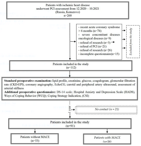 Statistical processing was carried out using the SPSS 17.0 software package. The distribution of quantitative variables was tested for normality using the Kolmogorov–Smirnov test. With a normal distribution, the data were presented as means (M) and standard error of the mean (SE), with the non-normal distribution presented as a median (Me) and quartiles (25th and 75th percentiles). Student’s t-test, the Mann–Whitney test, and the chi-squared test were used to compare the two groups. To assess the factors associated with the presence of an unfavorable prognosis after a PCI, a binary logistic regression analysis (forward stepwise LR method) was carried out; the following variables were included in the model: risk factors, clinical characteristics, and questionnaire data (DS-14—Type D, Zscore NA, Zscore SI, ZNA × ZSI, WCQ questionnaire, Appraisal Criteria of the Life Situation Difficulty, and TODS). Performance of type D parameters in discriminating the risk of an unfavorable prognosis (MACE development) after a PCI was evaluated through receiver operating characteristic curve analysis. The level of critical significance (p) was taken as 0.05.