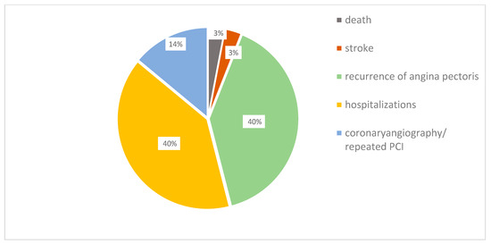 The pattern of MACE development is shown in Figure 2. A total of 38 patients (20 men and 18 women) underwent a MACE within 1 year after a PCI, including cardiac death (3.0%), stroke (3.0%), recurrent angina (40.0%), repeated CAG and/or percutaneous coronary intervention (14.0), and hospitalizations for cardiovascular diseases (40.0%).