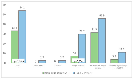 The presence of personality type D was detected in 37 patients, and the absence of personality type D was detected in 54 patients. When analyzing cardiovascular events, a significantly higher frequency was revealed in MACEs in general (54.1% versus 32.1%; p = 0.049) and in the frequency of hospitalizations in particular (29.7% versus 7.4%; p = 0.004) in the group of patients with type personality D compared with the individuals who were not related to type D personality. Otherwise, the groups did not differ in the frequency of other adverse events (Figure 3).