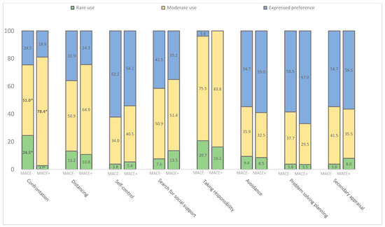 Distribution of coping strategies in CAD patients with and without MACEs 1 year after PCI (according to the WCQ questionnaire). * p < 0.001 compared MACE+ and MACE− groups.