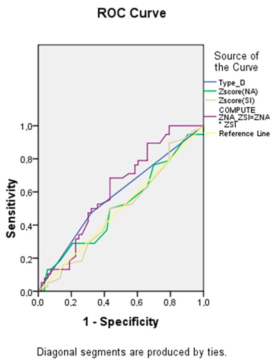 As shown in Table 7 and Figure 5, the largest area under the curve was for the ZNA × ZSI indicator, reflecting the possible synergistic effect of the negative affectivity and social inhibition subscales. However, the area for the curve for this variable was <0.7, indicating unacceptable discrimination.