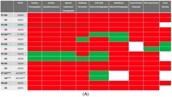 Despite BCVA of 20/40 or better in the majority (11 out of 16 eyes) of eyes at baseline, abnormalities were identified in all studied eyes using different imaging modalities. Serial images were obtained at follow-ups, and changes were identified and recorded. A stoplight chart depicting the baseline findings and subsequent improvement, worsening, or stagnation on follow-up are shown in Figure 1A,B, and it reveals how the use of multimodal imaging can detect abnormal findings despite relatively normal best-corrected visual acuity (BCVA) at presentation.