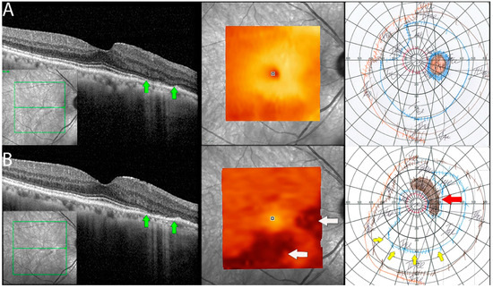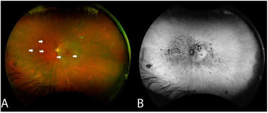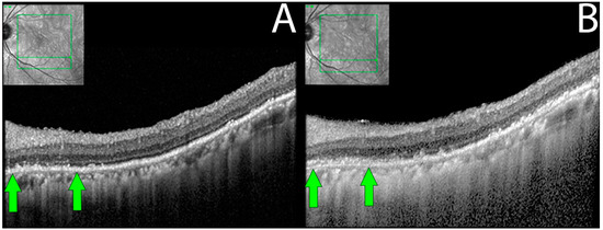 In 9 out of 16 eyes, RPE was disorganized, demonstrating focal losses with sharp delineation over the underlying Bruch’s membrane. In three eyes (18.7%), progressive worsening of RPE/Bruch’s membrane disorganization was also observed during the follow-up period (Figure 4).