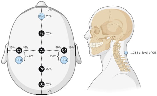 Cortical electrode placement. This figure displays the cortical electrode placement for SSEP signal recording used by the technicians from which waveform data were collected. The percentage values shown in the figure correlate to the approximate distance from the center reference point, Cz. For example, Fz is 20% of the distance from the center reference point to the anterior reference marker (nasal bridge), Fpz is located an additional 20% of the distance from Fz or 40% of the distance from Cz. The same applies to all reference markers and the associated percentages. The lateral reference markers are in line with the center of the ears, while the posterior reference marker is the center of the occiput.