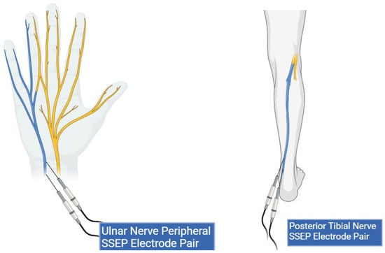 Peripheral lead targets for SSEP monitoring. This figure shows peripheral electrode placement for the ulnar (left) and posterior tibial nerves (right) (highlighted in blue). Two stimulation electrodes are shown in both peripheral targets representing the cathode and anode pair.