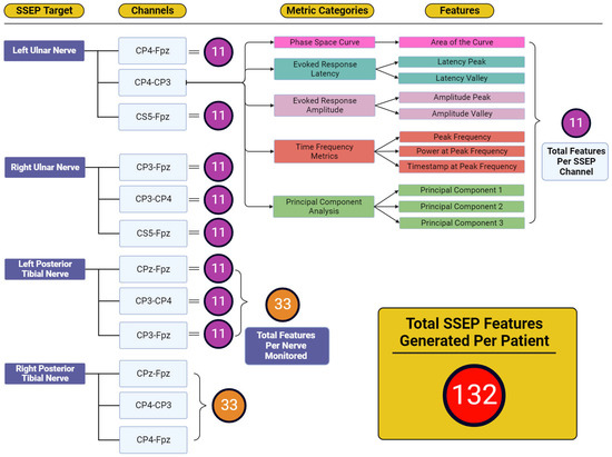 Further data processing and analysis were performed in MATLAB (MathWorks v.R2022a). Sourced (.json) files were converted into MATLAB (.mat) datafile format. SSEP data were identified and exclusively extracted from each trial. SSEP waveforms from different trials were sorted into new variables based on their respective nerve–channel pairing (e.g., left ulnar nerve: CP4–Fpz). Following the sorting of SSEP waveforms, feature generation metrics were developed as follows: