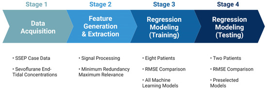 Development for machine learning system. The figure depicts the pathway towards the final ML predictive model used for analyzing SSEP data. Stage 1 comprised of data acquisition of the various datasets that were to be included in the study. Stage 2 was the generation of features used to represent the datasets in different signal processing tools, and the subsequent ranking of those features for their importance. Stage 3 was the training of the ML models that were considered for this study. Lastly, stage 4 was when the models were tested, and performance metrics were compared.
