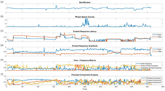 Raw data points of the metric categories for SSEP trials. This figure shows the plotted changes derived from the different metric categories and their associated features shown in Figure 3 for all ten patients. (a) is the plotted changes in sevoflurane concentration over the different trials. (b) is the plotted changes in the areas of the phase space curve over the different trials. (c) is the changes in the evoked responses latency peak and valleys for the different trials. (d) is the changes in the evoked responses amplitude peak and valleys for the different trials. (e) is the changes for all three features (peak frequency, power at peak frequency, and timestamp at peak frequency) in time frequency analysis signal processing for the different trials. (f) is the changes in the first three principal components for the different trials.
