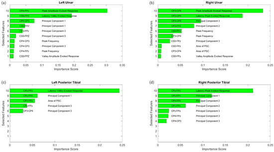 Similarly, for the right posterior tibial nerve, MRMR assigned importance scores for only five features, as all others were insignificant. Those five features selected for regression modeling in order were: the latency peak for the evoked response for channel CPz–Fpz, the first principal component for channel CPz–Fpz, the second principal component for channel CP4–Fpz, the second principal component for channel CPz–Fpz, the third principal component for channel CPz–Fpz, the third principal component for channel CP4–Fpz, and the third principal component for channel CP4–CP3.