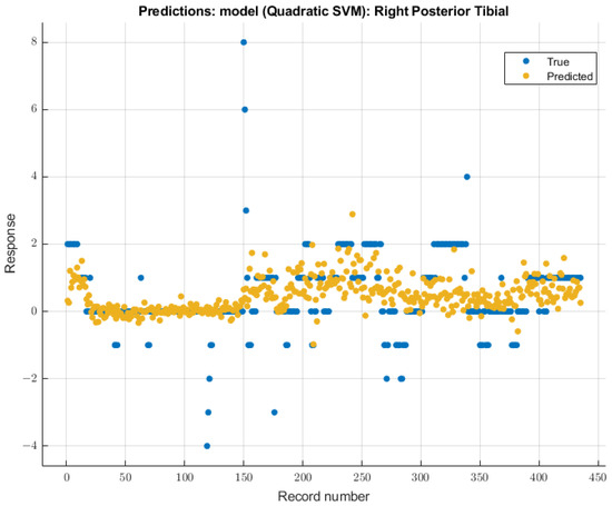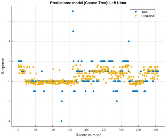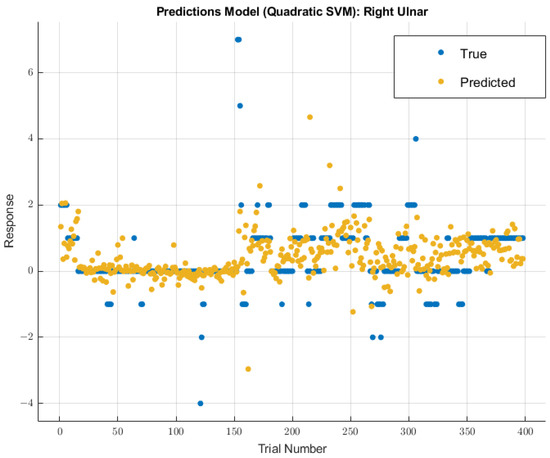 A different model displayed greater future predictability for the right ulnar nerve than the coarse tree model used for the left ulnar nerve. The quadratic SVM model showed a validation RMSE value of 0.96147 using training data. Using the features selected from MRMR calculations, the RMSE value on the test data was 2.4047. The modeling results for the right ulnar nerve are shown in Figure 9.