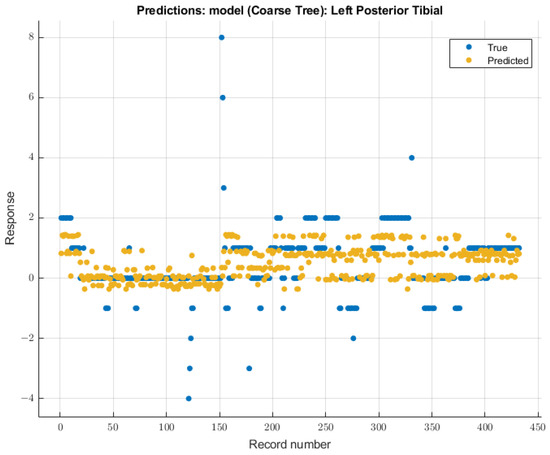 For the left posterior tibial nerve, similar to the left ulnar nerve, the coarse tree model showed the most remarkable future predictability on SSEP waveforms. The course tree model demonstrated an RMSE value of 1.0229 for validation of the training data. During testing, this model showed an RMSE value of 2.244. The modeling results for the left posterior tibial nerve are shown in Figure 10.