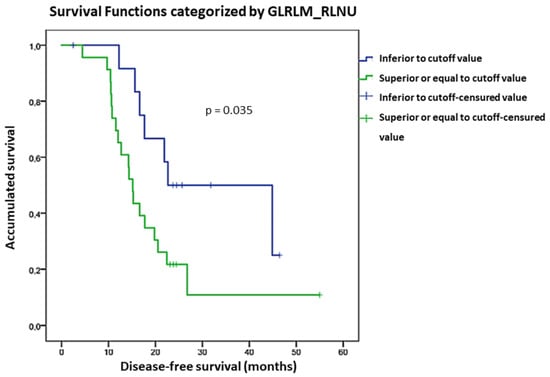 GLRLM_Run Length Non-Uniformity (GLRLM_RLNU) had an association with DFS although not statistically significative (p = 0.060). This association became significant when different gray levels resampling (in relative mode) was used (p = 0.045). In the survival analysis using ROC cut-off value, we found that patients with GLRLM_RLNU value < 7388.3 had more favorable DFS than those with GLRLM_RLNU > 7388.3 (p = 0.035, HR = 0.402 with a 95% CI, 0.167–0.965). DFS curves considering GLRLM_RLNU ROC cut-off value are shown in Figure 2.