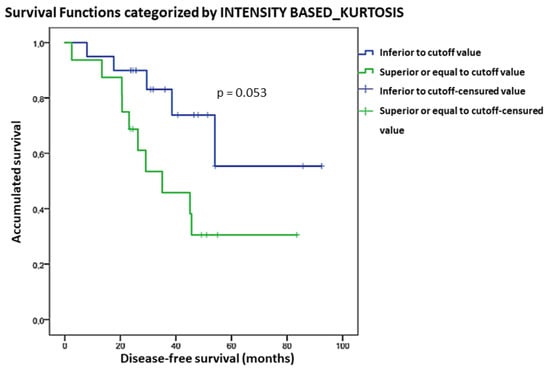 We found a significant association between Intensity-based Kurtosis and OS (p = 0.027). For each unit of incremented Kurtosis, the risk of death increased by 4.8%. However, no significant correlation was found in the subgroup analysis. OS curves considering Kurtosis are shown in Figure 3. Patients with Intensity-based Kurtosis value < 1.8 had a better OS than those with Intensity-based Kurtosis > 1.8, although not statistically significant (p = 0.053).
