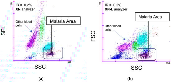 - Ningombam, A.; Sarkar, A.; Acharya, S.; Chopra, A.; Kumar, K.; Subramanian, A. Application of Sysmex XN-series automated haematology analyser in the rapid detection of malaria. Indian J. Hematol. Blood Transfus. 2020, 36, 512–518. [Google Scholar] [CrossRef] [PubMed]