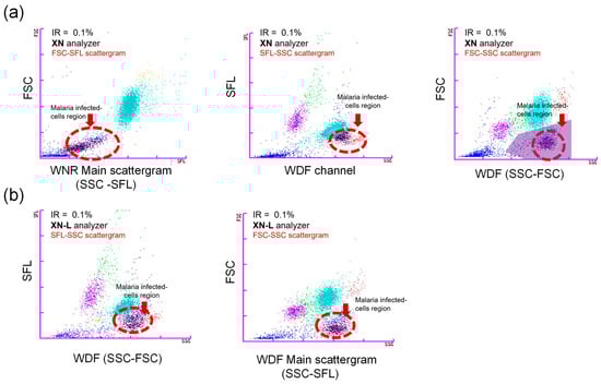 Flow cytometry scattergram plots of blood specimens for samples with a low malaria infestation rate (IR). Typically used scattergrams are the SFL-SSC and FSC-SSC flow plots on the XN and XN-L analyzers, respectively. (a) Different scattergrams produced by the XN analyzer. P. vivax malaria-positive clustering on the XN analyzer (IR 0.1%) was observed in both WNR and WDF channels. (b) Scattergram of a P. vivax malaria-positive sample on the XN-L analyzer (IR 0.1%) in the WDF channel.