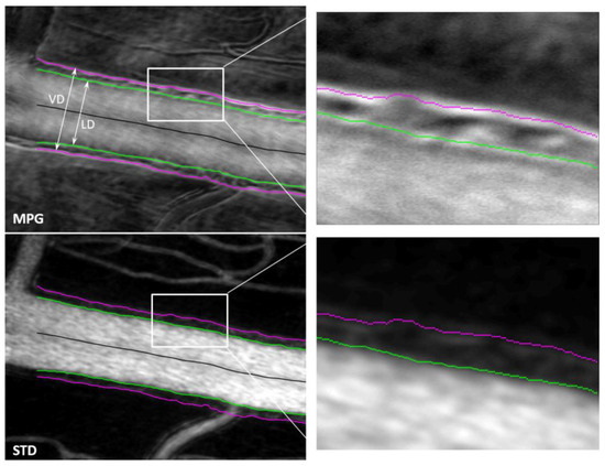 MPG (top) and STD (bottom) images with segmented vessel walls (magenta and green). The right-side column shows a magnified view of the white rectangle area in the left-side images. (VD—vessel diameter; LD—lumen diameter).