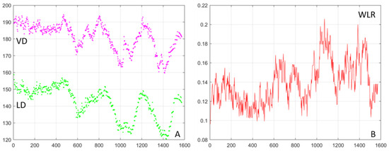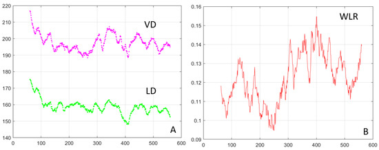 (A) Vessel diameter (VD—magenta) and lumen diameter (LD—green) for a scan partially shown in Figure 8C; axes in µm. (B) Wall-to-lumen ratio (WLR).