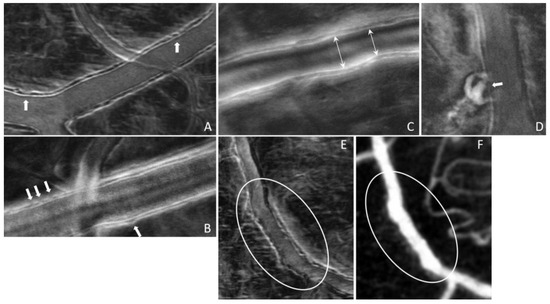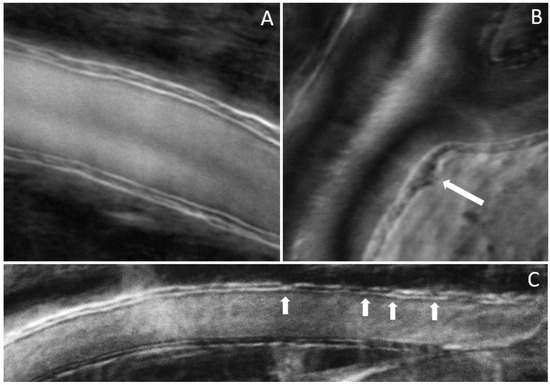 The imaging method and the analysis procedure presented here enable the identification of structural abnormalities that are the result of disease, DR due to T1D in particular in this study. Loss of structural integrity of the blood vessel wall may result in MAs, a hallmark lesion of DR, which may leak or rupture and further cause visual decline. Figure 7 and Figure 8 show several examples of structural distortions in subjects with various levels of DR severity. The healthy eye illustrated in Figure 7A has strong continuous vessel borders. In contrast, the rest of the images in Figure 7 and Figure 8 show disruptions in the vessel walls, indicated by the arrows, either bulging or local thinning of walls that may become the location of future MAs like the one shown in Figure 8D (arrow). Additional videos (Videos S2 and S3) and an image (Figure S1) are included in the Supplementary Materials to illustrate very faint blood flow through the MA, which is confirmed in the STD image by the very dim motion contrast bulge next to the blood vessel. Figure 8E,F show significant variations in the lumen diameter in a portion of the vessel that has no additional branches (white oval) for a PDR subject. It is expected that the lumen diameter changes across a branch for flow conservation while it should be relatively constant in between branches. DR might affect the elasticity/stiffness of the vessel wall, and distortions could occur, such as those illustrated here. Similarly, Figure 9 shows tremendous variations in the lumen and vessel diameters along a vessel of an eye with moderate NPDR. It seems that the wall thickness is relatively constant while the lumen/vessel diameter varies significantly (also arrows in Figure 8C). The result is a large variation in WLR along the vessel, as shown in Figure 9B, in between branches. Future prospective studies may elucidate whether increased variation in WLR is associated with future problems related to vessel wall integrity.