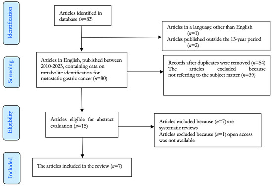 During a timeframe of 13 years, after searching the combination of keywords mentioned, a number of 83 articles, containing data on metabolite identification for metastatic gastric cancer, were found. From this selection of articles, one was eliminated because it was not written in English and two of them were published outside the selection period. All duplicated articles, publications not referring to the matter, systematic reviews, and access restriction papers were eliminated, thus making seven scientific papers eligible for this study.