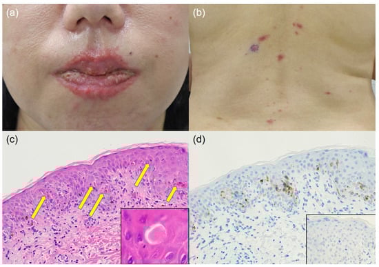 The patient presented with sores on her lips and mouth (Figure 1a) and erythema of the whole body (mainly on the palms and soles). A 5 mm skin punch biopsy was taken from erythema on the dorsal surface of her back (Figure 1b). The histopathological examination of the epidermis, dermis, and subcutaneous adipose tissue samples showed numerous necrotic keratinocytes in the epidermis (Figure 1c, arrows). In a recent study, the cleaved caspase-3 immunohistochemistry showed that a regulator of extracellular matrix (ECM) integrity, lumican, a small leucine-rich proteoglycan, exhibited anti-tumor properties in melanoma [1]. Therefore, cleaved caspase-3 immunohistochemistry is a very useful technique for studying dermatopathology.