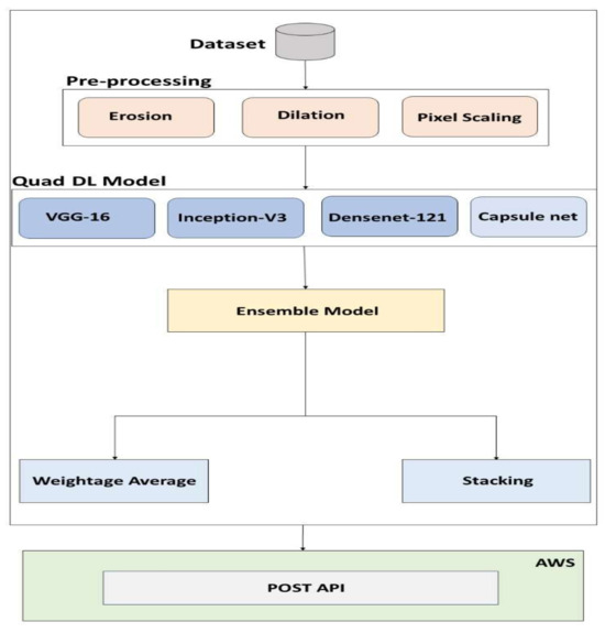 - We used three deep transfer learning models, i.e., VGG-16, Densenet-121, and Inception-v3, and one CapsNet model during the process of stacking and weighed averaging.