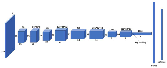 Densenet-121 consists of five blocks and three levels, and all are interconnected. Each block consists of several convolutional layers and a max-pooling layer. After flattening the output matrix after block 5, there are two layers for binary classification that are fully connected [43], and this is shown in Figure 6.