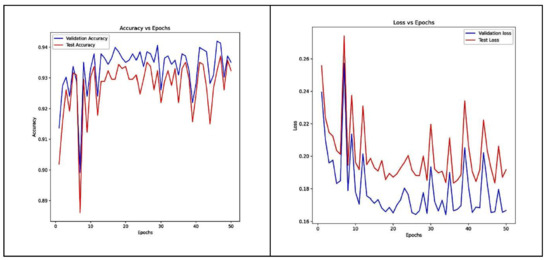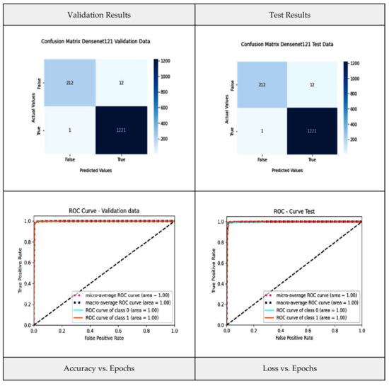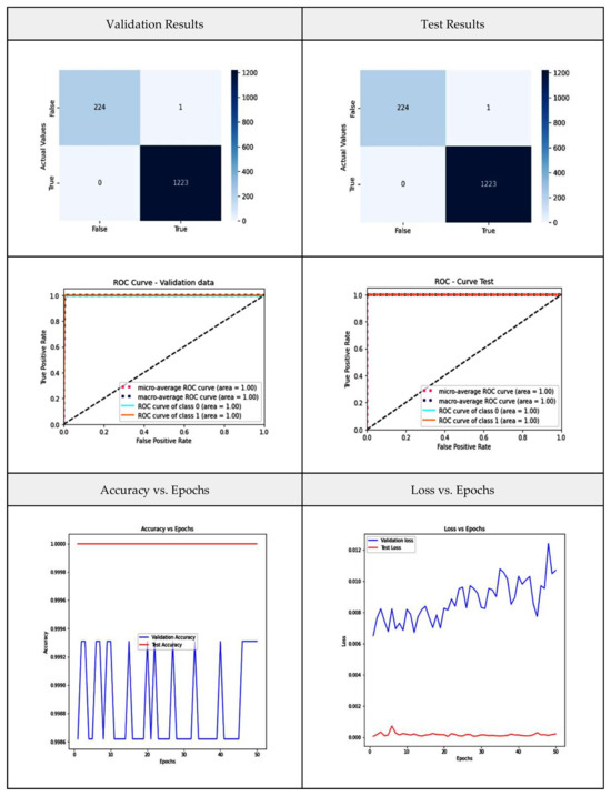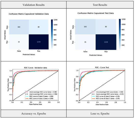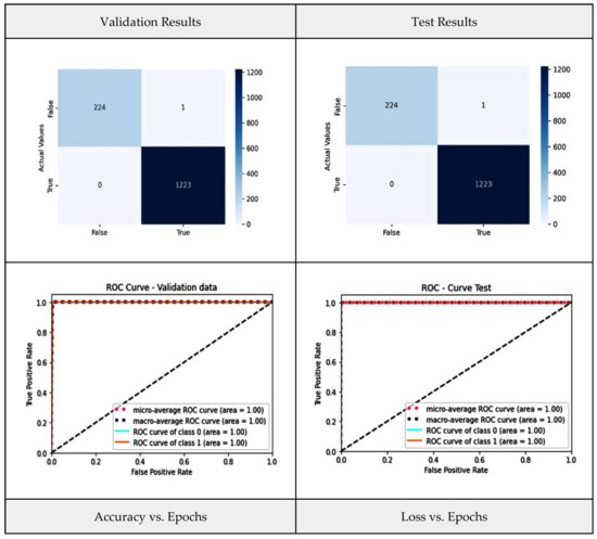 Figure 15 shows the ensemble weighted-average model performance metrics, such as the confusion matrix and the ROC for the validation and test data, as well as graphs for accuracy vs. epochs and loss vs. epochs.