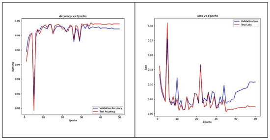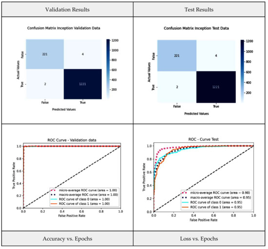 The inception network is one of the novel models in the field of transfer learning. The architectural design of the model consists of repeating components referred to as inception modules [44], and it is represented in Figure 8. Figure 9 shows the inception model performance metrics, such as the confusion matrix and the ROC for the validation and test data, as well as graphs for accuracy vs. epochs and loss vs. epochs.