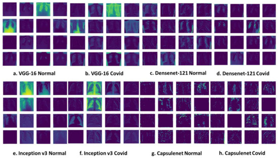Figure 12 shows a feature map for COVID and normal images as generated by VGG-16, Densenet-121, Inception V3 and CapsuleNet, respectively.
