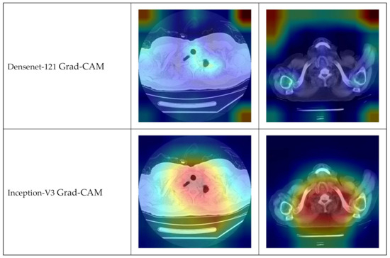 Grad-CAM (Gradient-weighted Class Activation Mapping) is a valuable technique in the context of COVID-19 classification using transfer learning and capsule networks (CapsuleNet). In this scenario, the primary task is to determine whether CT-scan images of a patient’s lungs exhibit signs of COVID-19 or not. Transfer learning plays a pivotal role by leveraging pre-trained models, such as inception, which have learned rich features from extensive datasets like ImageNet. These models serve as a foundation for the COVID-19 classification task, allowing for the adaptation of their knowledge to a smaller and specific COVID-19 dataset. The Grad-CAM results are represented in Figure 13.