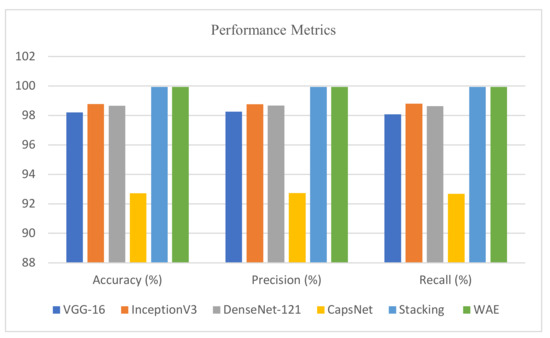 We consolidated the average accuracy, average precision and average recall attained by base learners and our proposed ensemble models, and the results are exhibited in Figure 16. It is clear from the figure that both the stacking and WAE models achieved almost equal accuracy, precision and recall values of 99.9%. Hence, both the models are equally competent in detecting the COVID variants. Thus, this signifies that training the images using either of the ensemble methods boosts the classification performance; therefore, the model is reliable and can be employed for tracing the virus strain in lungs.