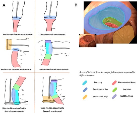 From Riviere et al.’s paper [20]. (A). Graphical representations of the different types of ileocolonic anastomoses. (B). Graphical overlay of color legend according to an endoscopic picture in order to differentiate different parts of the anastomotic anatomy. For different anastomotic shapes, the endoscopist should refer to different terminology. Areas of interest are the neoterminal ileum, the ileal inlet (the area approximately 1 cm from where there is the passage between the anastomotic body and the afferent ileal limb), the ileal anastomotic body, the ileal blind loop, the anastomotic line (where the ileal and colonic walls are in direct contact), and the colonic blind loop. Not all anastomotic shapes have all these elements, but considering the type of anastomosis, the report should refer elemental lesions to the correct areas.