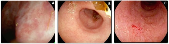The MES 0 degree includes both completely normal-appearing mucosa and areas of healing (with scarring (see Figure 3A) or with post-inflammatory polyps, regardless of erosions on their tops), but no erythema, friability, erosions, or ulcers are admitted, and the vascular pattern should be clearly recognized. The MES 1 degree is usually considered in continuity with MES 0. However, a higher amount of mucosal edema results in the blurring and partial obliteration of the vascular pattern, and the mucosa looks coarser, with more fragmented light scattering, sometimes with mild erythema distributed evenly across the area (Figure 3B). MES 1 is perceived as a transition from MES 0 to MES 2, but it is remarkably less inflamed than the latter. The main landmarks to increase endoscopic activity to the MES 2 degree are diffuse erythema with friability (which is not easily assigned in still images or videos recorded elsewhere) and erosions (Figure 3C). The features leading to the highest degree, MES 3, are either ulcers or spontaneous bleeding (they should not coexist to be scored as MES 3). Ulcers usually occur in areas of erythema, friability, and spontaneous bleeding, which have to be observed live to be recognized and are the consequence of extreme friability and may be present before the scope intubation of a segment. Typical UC endoscopic lesions are uniform, but after treatment or in long-standing colitis, these areas may coexist with more severe lesions (MES 2–3) and areas with complete or near-complete remission (MES 0–1). In latter cases, however, the endoscopist should score the MES according to the most severe endoscopic lesions observed, even if present in only a few cm of the colon out of several cm explored overall.